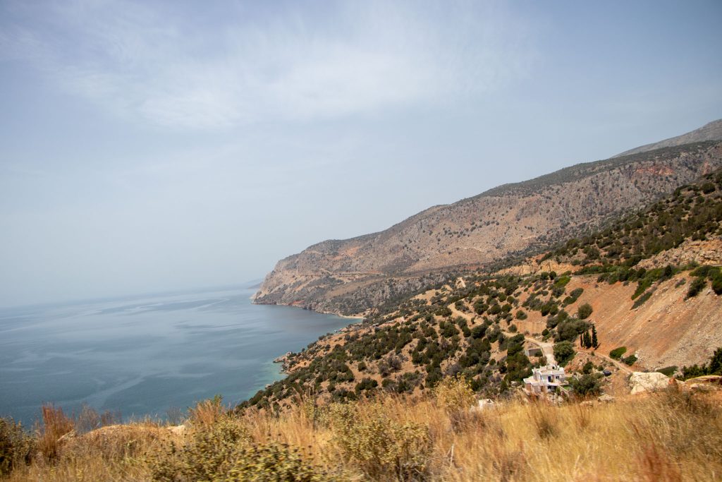 Eens terug op het vasteland volgen we de kust. Het landschap, de vegetatie en de huizen zijn hier anders, maar niet minder mooi. Door het zeebriesje daalt de temperatuur tot een goeie 25 graden. We passeren onder andere de bekende badplaats Glyfada. Juist voor Itea parkeren we onze moto net niet in het water, en smullen we van onze lunch, taramasalata, in het zonnetje, met de voetjes in het water. Het is genieten. Ook hier weer geen kat te zien. Als de honger gestild is, zetten we weer aan richting Itea. Amai, hier is het zeer toeristisch, niks voor ons, maar er is hier een postkantoor. We vinden het, en de postkaarten zijn dus onderweg naar België. Benieuwd wanneer deze gaan toekomen.