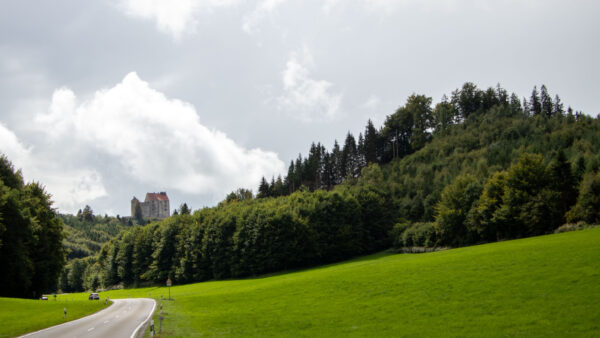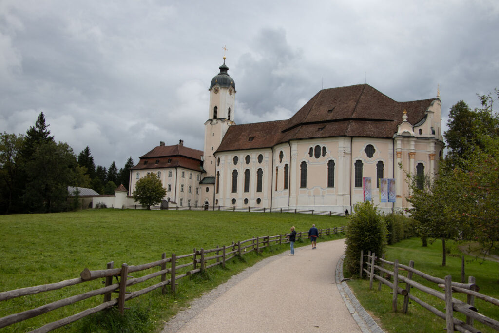 Als we Oostenrijk buitenrijden, komen we terecht in een soort natuurpark, waar de koeien in het midden van de weg staan. Zalig om te zien. We zijn inmiddels ook te weten gekomen dat de batterij van Raoul nog niet werkt; hij kan niet starten, we moeten hem duwen en dan gaat hij in gang; het moet een mooi zicht geweest zijn. Ergens voor de middag komen we aan in Schwangau waar we zicht hebben op 2 prachtige kastelen, ze komen recht uit de films van Disney. Het krioelt hier van het volk. Iets later komen we toe aan de Wieskirche. Hier smullen we van een hete kom verse kippensoep, en dan gaan we het kerkje bezoeken, zeg maar kerk. Het is echt prachtig. We laten een kaarsje branden … Ook de omgeving is zeer mooi, je kan zeggen dat het hier nog echt groen is.